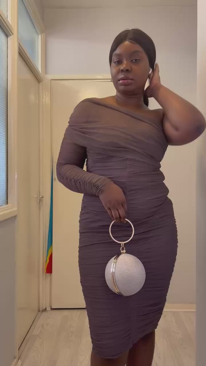 Ruched mesh midi dress, one shoulder